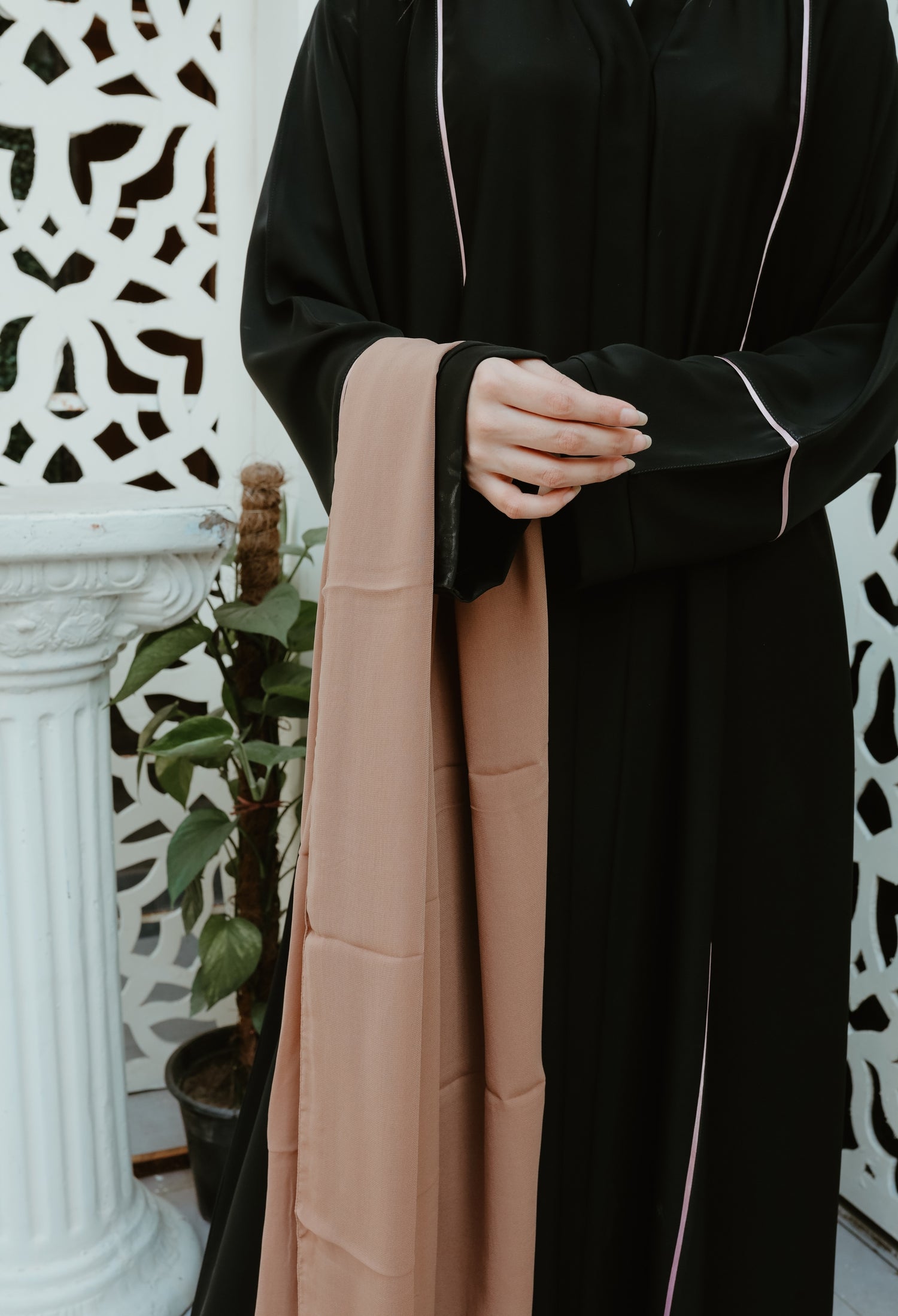 Design: Classic black abaya with rose gold stripe and fine stone detailing along the hemline